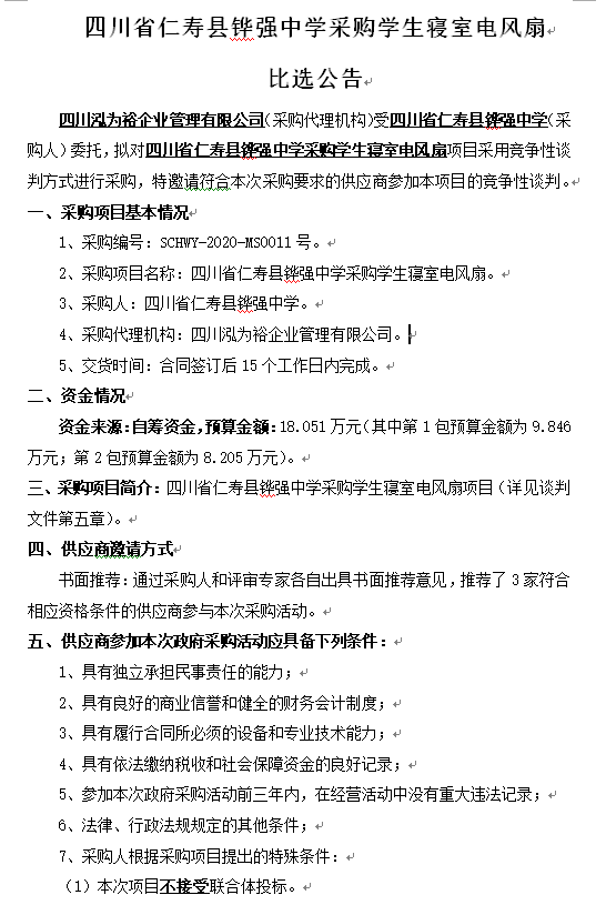 四川省仁寿县铧强中学采购学生寝室电风扇 比选公告